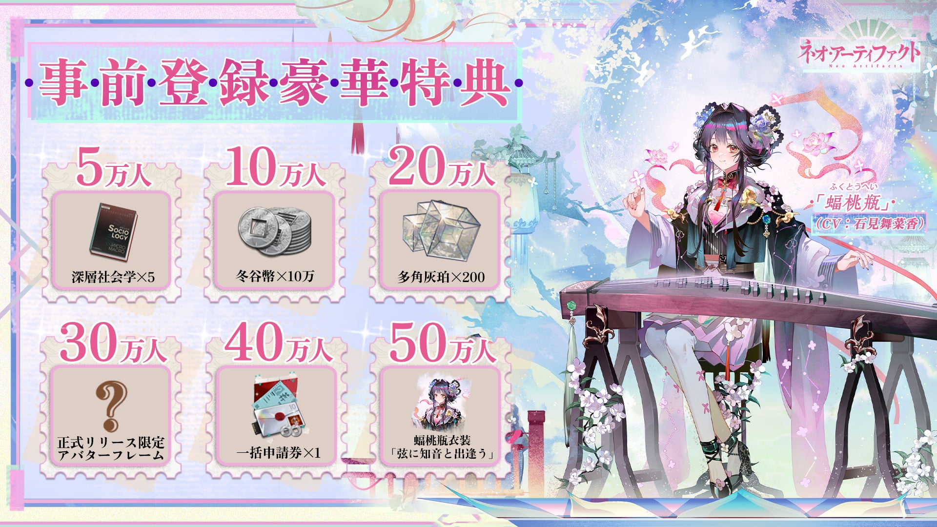 事前登録者数に応じて、サービス開始時に豪華報酬を配布するキャンペーンを実施中です。現在、目標の50万人を突破すると、★5キャラクター「蝠桃瓶(ふくとうへい)」(CV:石見舞菜香)の限定衣装を全プレイヤーにプレゼントいたします。