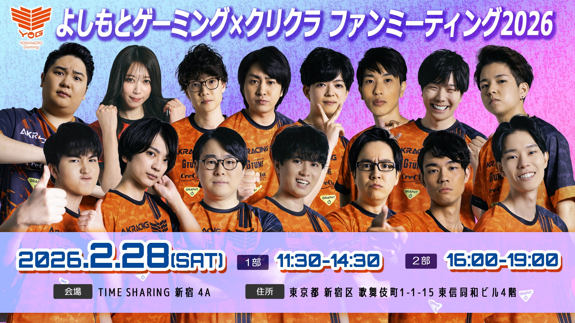 よしもとゲーミング×クリクラ ファンミーティングでは、よしもとゲーミングに所属する総勢16名の選手が参加する予定です。普段なかなか触れ合うことができない選手たちとのトークやビンゴゲームなど、ファンの皆さまに楽しんでいただけるイベントになっております。