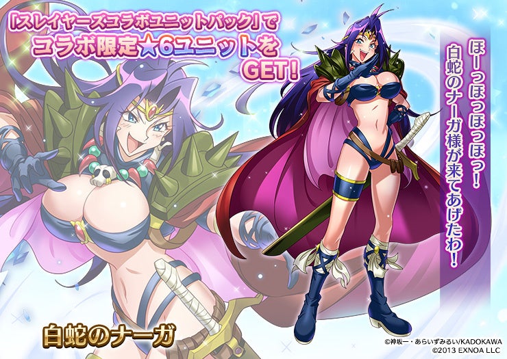 召喚などに使える「神聖結晶」や、レアリティブラックのコラボユニット『白蛇のナーガ』などがおまけについた、「スレイヤーズコラボユニットパック」を期間限定で販売いたします!