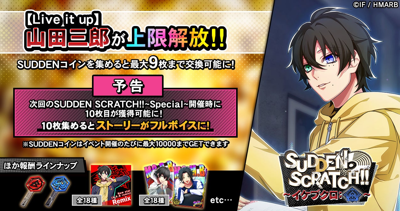 イベント期間中、KILLER SCRATCH!!をプレイするとライズ消費量に応じた確率でSUDDEN SCRATCH!!が発生します。SUDDEN SCRATCH!!をプレイすると、通常の報酬アイテムの他、限定アイテム「SUDDENコイン」を獲得することができます。「SUDDENコイン」を集めることで、「A.R.B remix」楽曲やレイズキー、イケブクロ・ディビジョンのデコステッカーに使えるブースターなどと交換することが可能です。また、ストーリーカード「SSR【Live it up】山田三郎」が上限解放され、最大9枚まで獲得できます。さらに、SUDDEN SCRATCH!!~Special~の開催時には10枚目が獲得可能となり、10枚集めるとカードストーリーがフルボイスに!