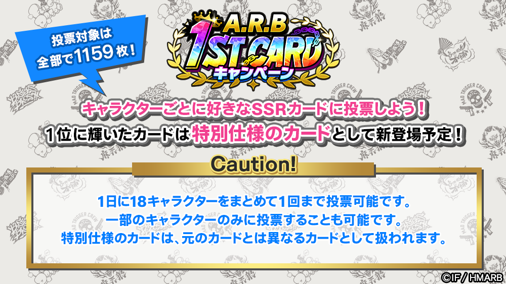「A.R.B 1ST CARDキャンペーン」は、プレイヤーの皆様の投票によって、キャラクター別に1位のSSRカードを決める投票企画です。見事1位に選ばれた18枚のSSRカードは、後日特別仕様のカードとしてゲームアプリ内に登場予定!投票期間中、毎日キャラクター別に1票ずつ投票が可能ですのでお見逃しなく。