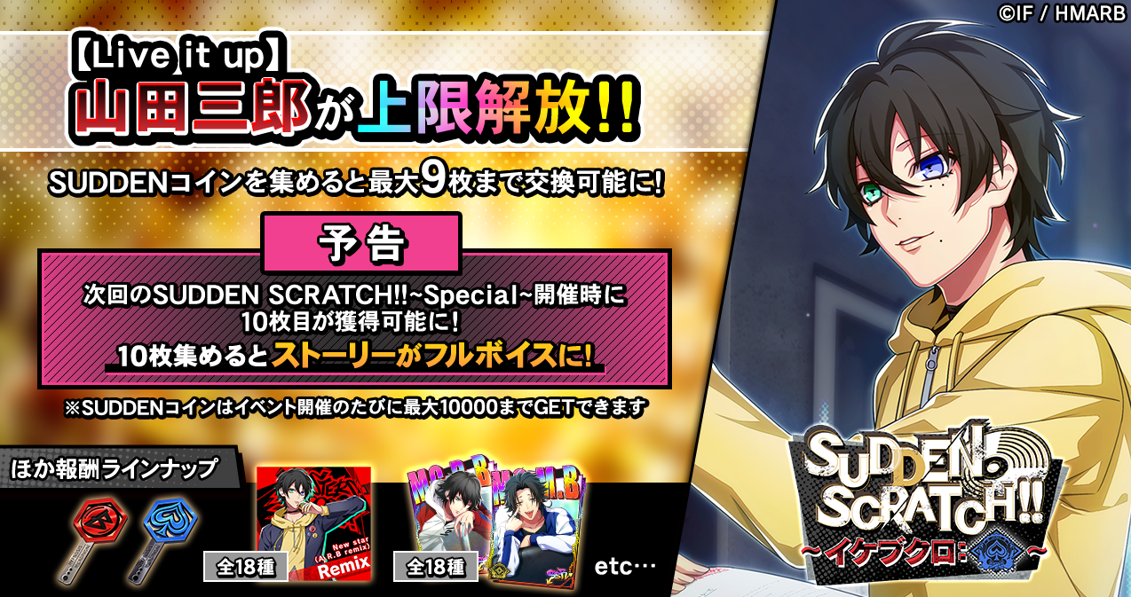 イベント期間中、KILLER SCRATCH!!をプレイするとライズ消費量に応じた確率でSUDDEN SCRATCH!!が発生します。SUDDEN SCRATCH!!をプレイすると、通常の報酬アイテムの他、限定アイテム「SUDDENコイン」を獲得することができます。「SUDDENコイン」を集めることで、「A.R.B remix」楽曲やレイズキー、イケブクロ・ディビジョンのデコステッカーに使えるブースターなどと交換することが可能です。また、ストーリーカード「SSR【Live it up】山田三郎」が上限解放され、最大9枚まで獲得できます。さらに、SUDDEN SCRATCH!!~Special~の開催時には10枚目が獲得可能となり、10枚集めるとカードストーリーがフルボイスに!