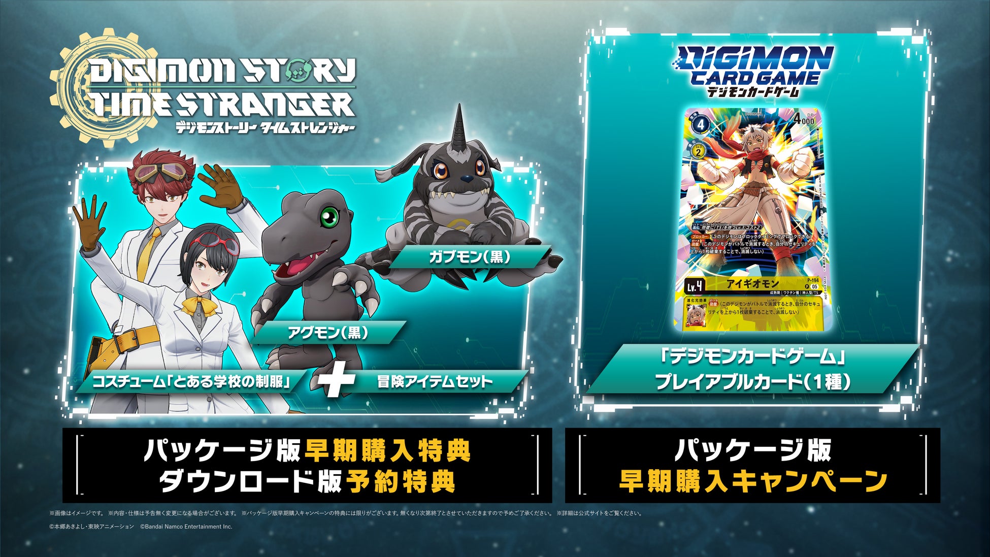 また、パッケージ版では本作の物語の中でも鍵を握るデジモン「アイギオモン」の「デジモンカードゲーム」プレイアブルカードがもらえる早期購入キャンペーンも実施中!是非ご予約ください!