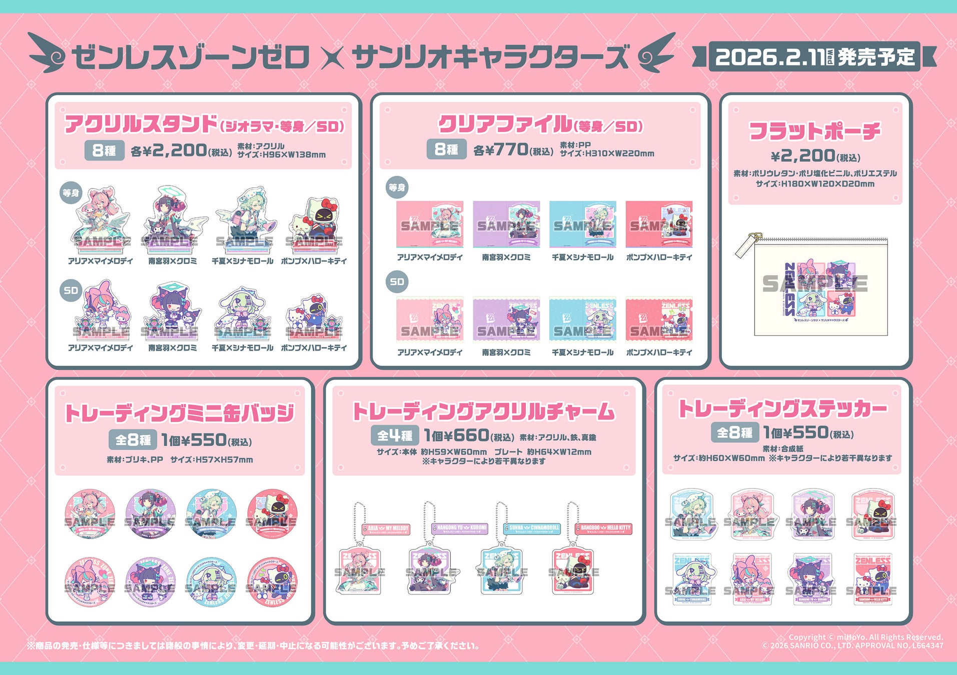 グローバルに展開するインタラクティブエンターテインメントのブランドであるHoYoverse(運営:株式会社COGNOSPHERE)は、最新都市ファンタジーアクションRPG『ゼンレスゾーンゼロ』と、株式会社サンリオ(本社:東京都品川区、以下サンリオ)の人気キャラクターである『サンリオキャラクターズ』とのコラボグッズを、2026年2月11日(水)より全国のGiGOグループのお店およびアニメイトにて発売いたします。