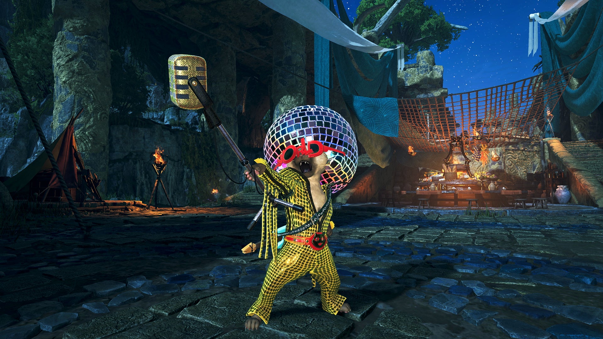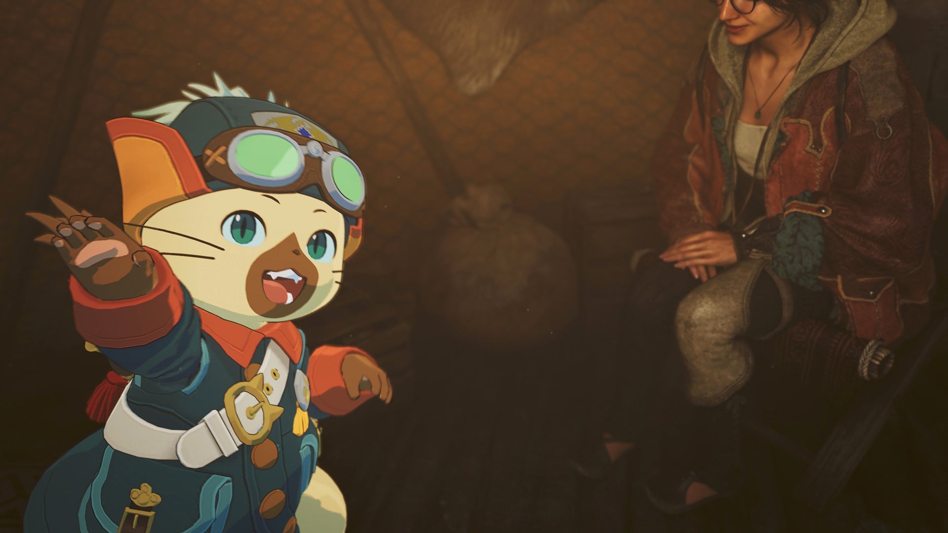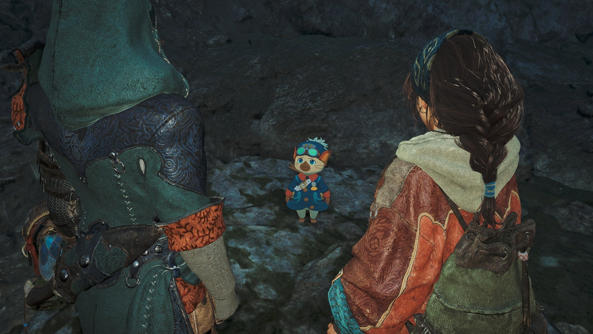 緋の森のベースキャンプで、ハンターたちはアズラル国から来たロイヤルアイルー、ルディと出会う。