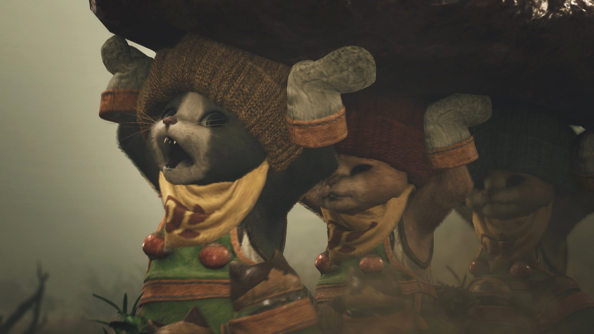 緋の森のベースキャンプで、ハンターたちはアズラル国から来たロイヤルアイルー、ルディと出会う。