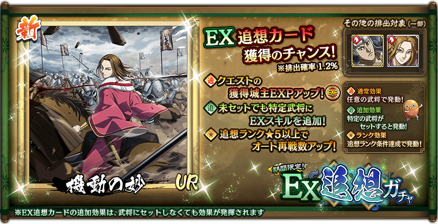 獲得することで対象武将に新たなEXスキルが解放される『EXスキル追加追想カード』が排出されます!