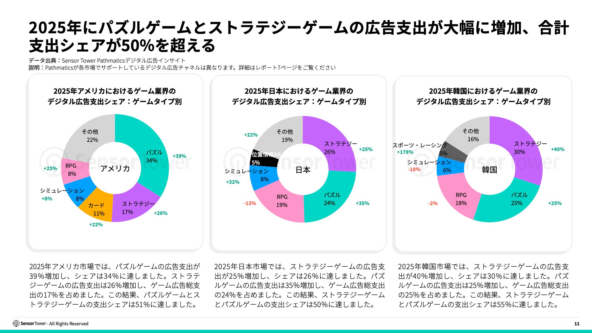 ストラテジーとパズルゲームの収益増加は、デジタル広告配信への投資強化と切り離せません。2025年、ストラテジーとパズルゲームのアメリカ、日本、韓国市場における広告支出シェアの合計はいずれも50%を超え、強い上昇トレンドを示しています。ストラテジーゲームのアメリカ、日本、韓国市場における広告支出はそれぞれ26%、25%、40%上昇し、パズルゲームはそれぞれ39%、35%、25%増加しました。