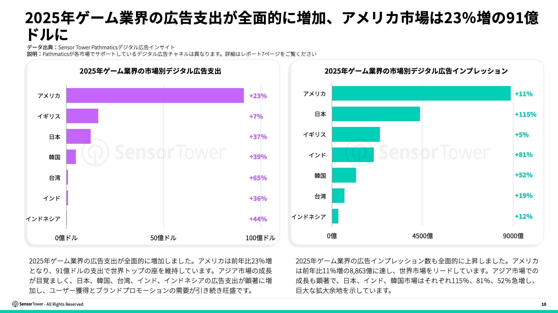 2025年ゲーム業界の広告支出が全面的に増加しました。アメリカは前年比23%増となり、91億ドルの支出で世界トップの座を維持しています。アジア市場の成長が目覚ましく、日本、韓国、台湾、インド、インドネシアの広告支出が顕著に増加し、ユーザー獲得とブランドプロモーションの需要が引き続き旺盛で、巨大な拡大余地を示しています。