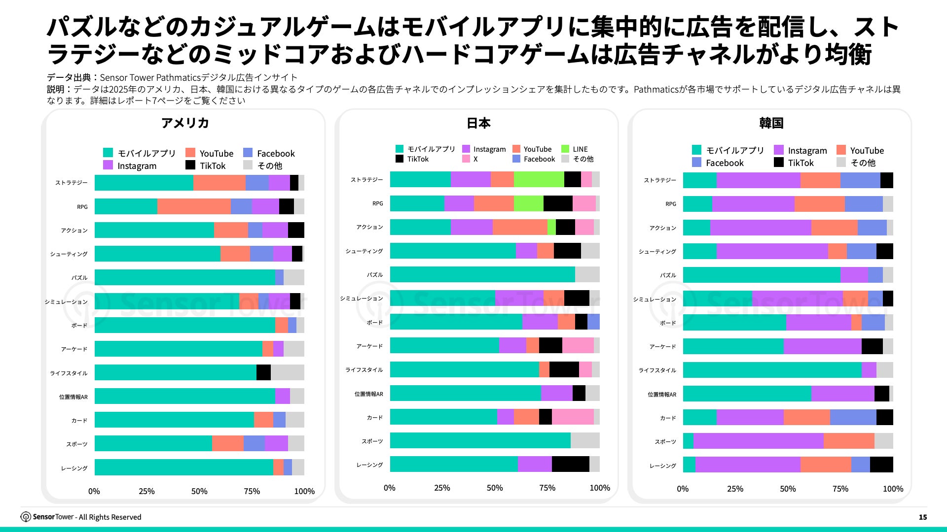 パズルなどのカジュアルゲームはモバイルアプリに集中的に広告を配信し、ストラテジーなどのミッドコアおよびハードコアゲームは広告チャネルがより均衡