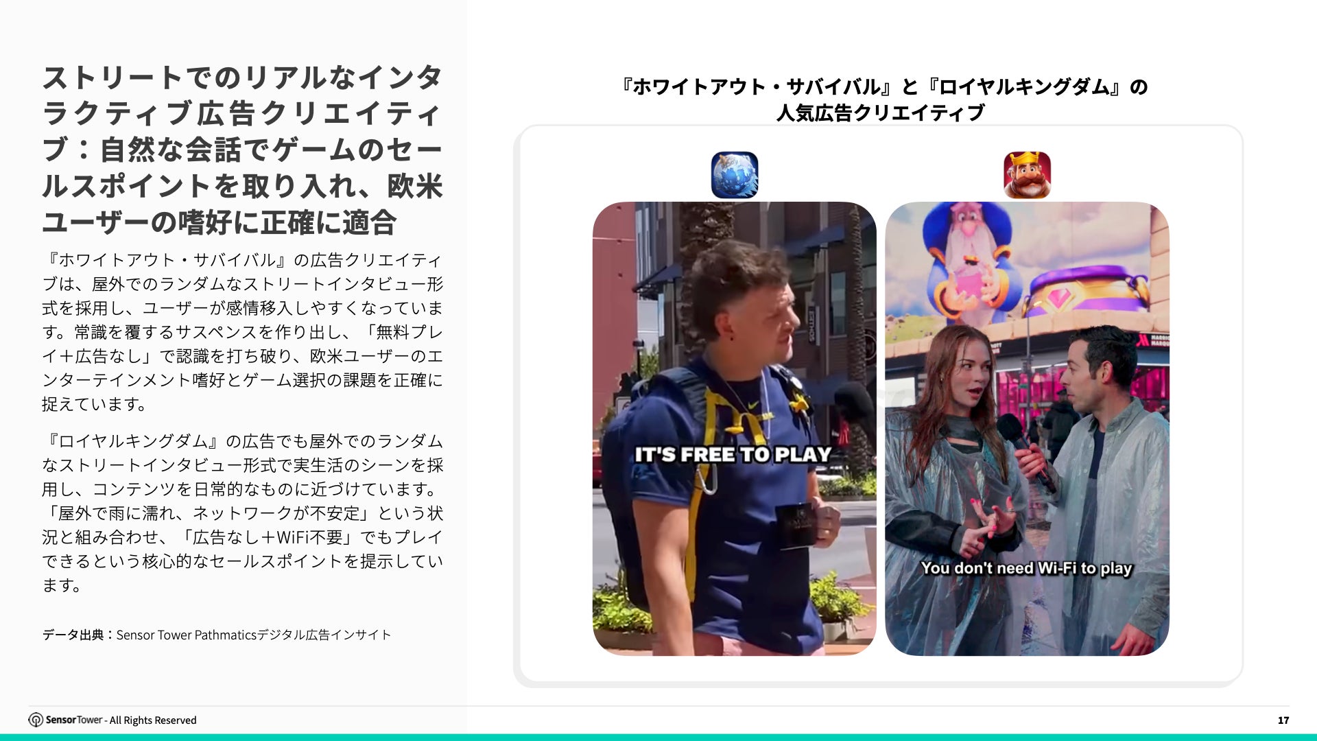 ストリートでのリアルなインタラクティブ広告クリエイティブは、自然な会話でゲームのセールスポイントを組み込み、欧米ユーザーの嗜好に正確に適合します。