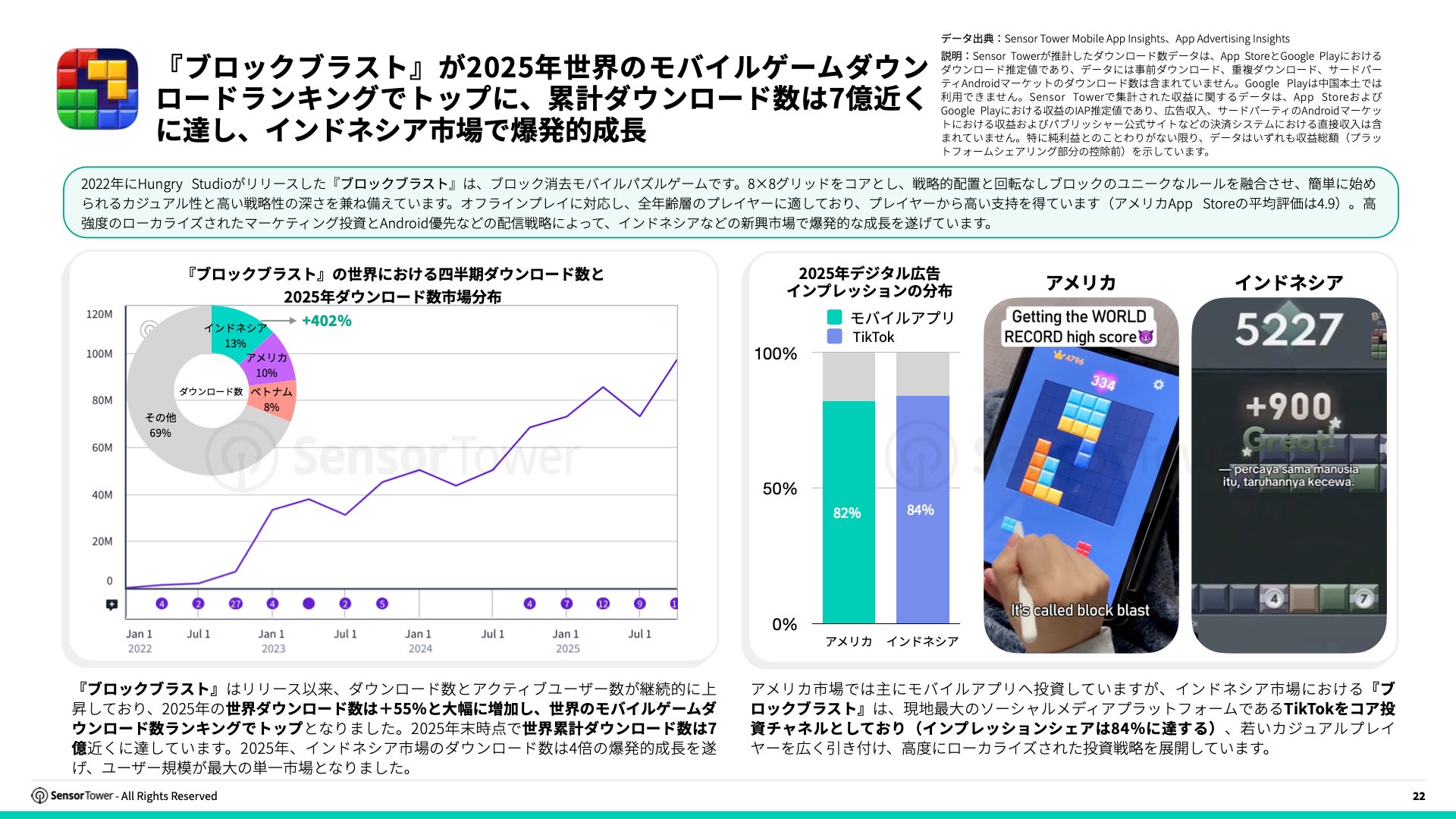 アメリカ市場では主にモバイルアプリへ投資していますが、インドネシア市場における『ブロックブラスト』は、現地最大のソーシャルメディアプラットフォームであるTikTokをコア投資チャネルとしており(インプレッションシェアは84%に達する)、若いカジュアルプレイヤーを広く引き付け、高度にローカライズされた投資戦略を展開しています。