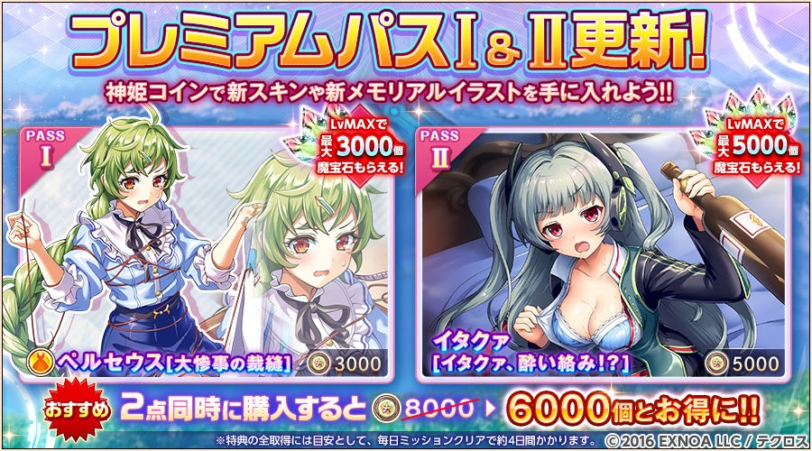 神姫コインで購入できるプレミアムパスⅠ・Ⅱの追加特典には、なんと英霊スキンやメモリアルイラストも!詳細はゲーム内をご確認ください!