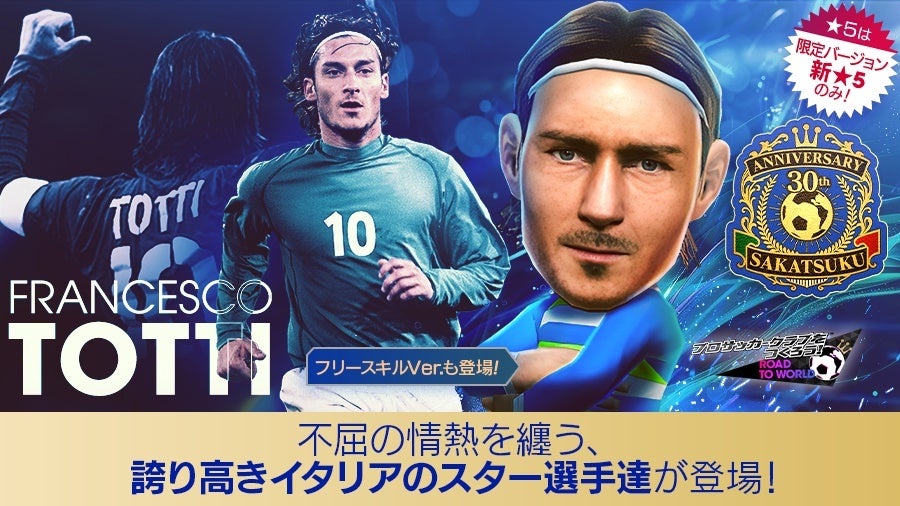 好評配信中のスポーツ育成シミュレーションゲーム『プロサッカークラブをつくろう! ロード・トゥ・ワールド』(以下 サカつくRTW)では、イタリアのレジェンド「フランチェスコ・トッティ」などのスーパースターが、得意戦術カウンターの新★5選手として登場する“SAKATSUKU 30th Anniversary LEGEND SCOUT”を2026年2月12日(木)より開催します。