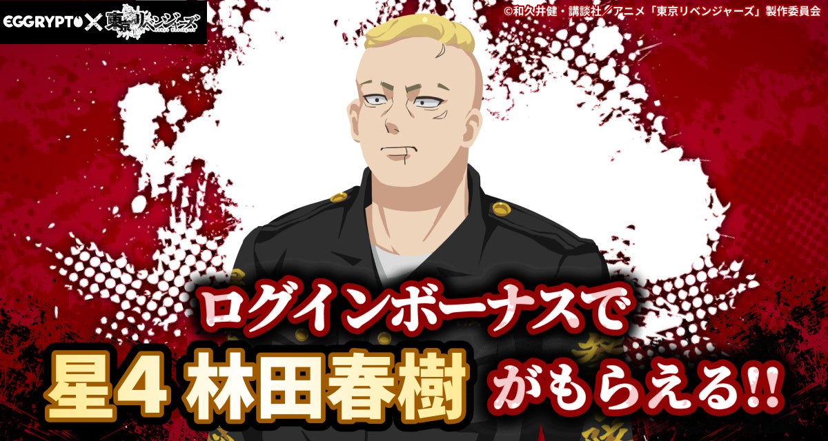 また、期間中ログインしていただいたユーザーの皆様に、限定キャラクター★4「林田春樹」をプレゼントする期間限定ログインボーナスを開催いたします。この機会にぜひEGGRYPTOをお楽しみください。