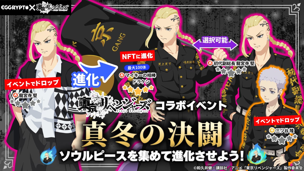 株式会社GameWith(本社:東京都港区、代表取締役社長:今泉卓也、以下「GameWith」)は、出資先であり事業パートナーである株式会社Kyuzan(本社:東京都渋谷区、代表取締役:髙橋 卓巳、以下「Kyuzan」)と共同開発した、アプリで簡単に遊べるNFTゲーム「EGGRYPTO(エグリプト)」において、『東京リベンジャーズ』とのコラボイベントを本日2月13日(金)12時より開催いたします。
