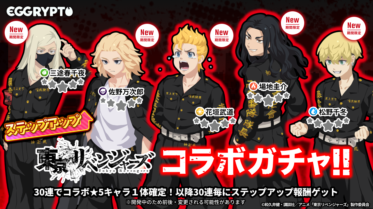 株式会社GameWith(本社:東京都港区、代表取締役社長:今泉卓也、以下「GameWith」)は、出資先であり事業パートナーである株式会社Kyuzan(本社:東京都渋谷区、代表取締役:髙橋 卓巳、以下「Kyuzan」)と共同開発した、アプリで簡単に遊べるNFTゲーム「EGGRYPTO(エグリプト)」において、『東京リベンジャーズ』とのコラボイベントを本日2月13日(金)12時より開催いたします。