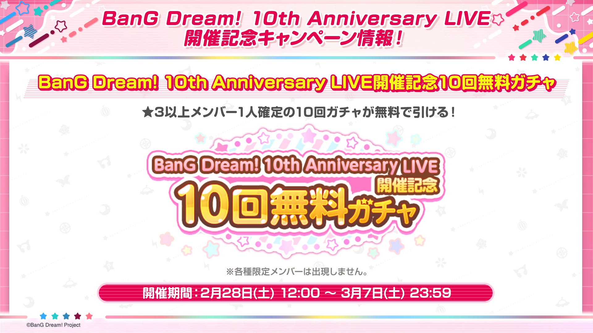 2月28日(土)12時から「BanG Dream! 10th Anniversary LIVE開催記念 10回無料ガチャ」を開催いたします。
