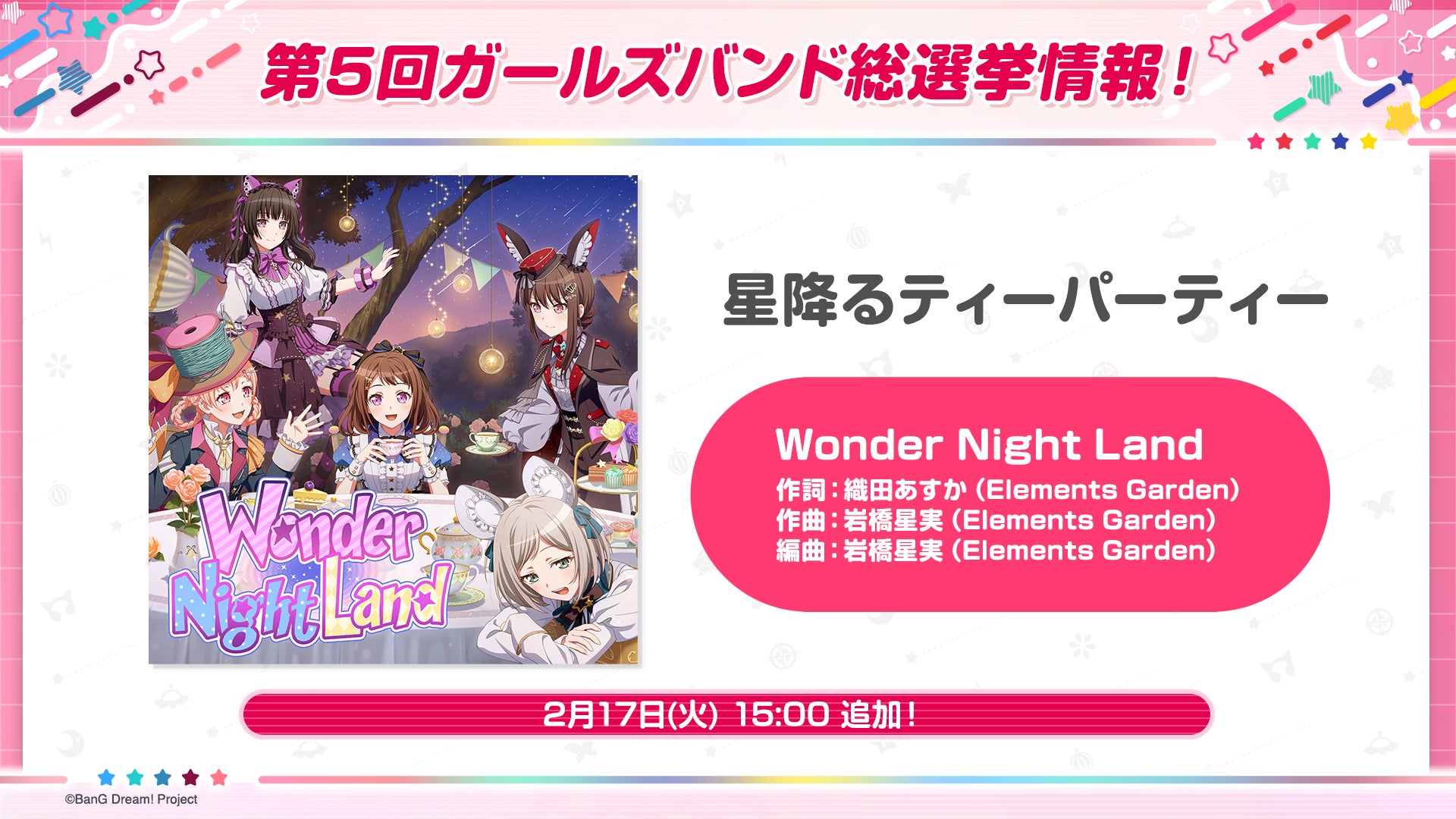 2月17日(火)15時に、「星降るティーパーティー」による楽曲「Wonder Night Land」をゲーム内へ追加いたします。