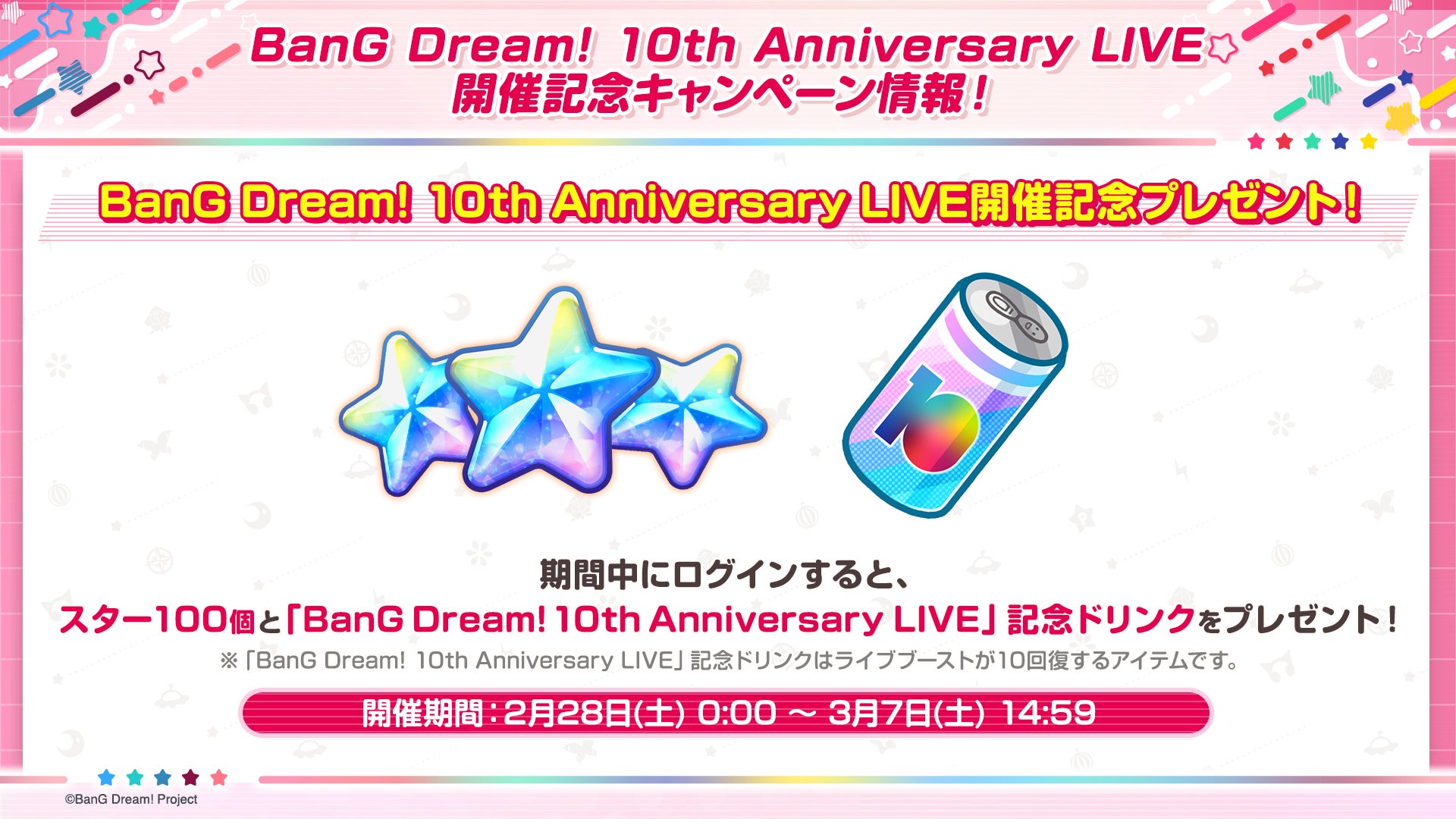 開催期間の2月28日(土)0時から3月7日(土)14時59分までの間にログインすることで、スター100個と「BanG Dream! 10th Anniversary LIVE」記念ドリンクを受け取ることができます。