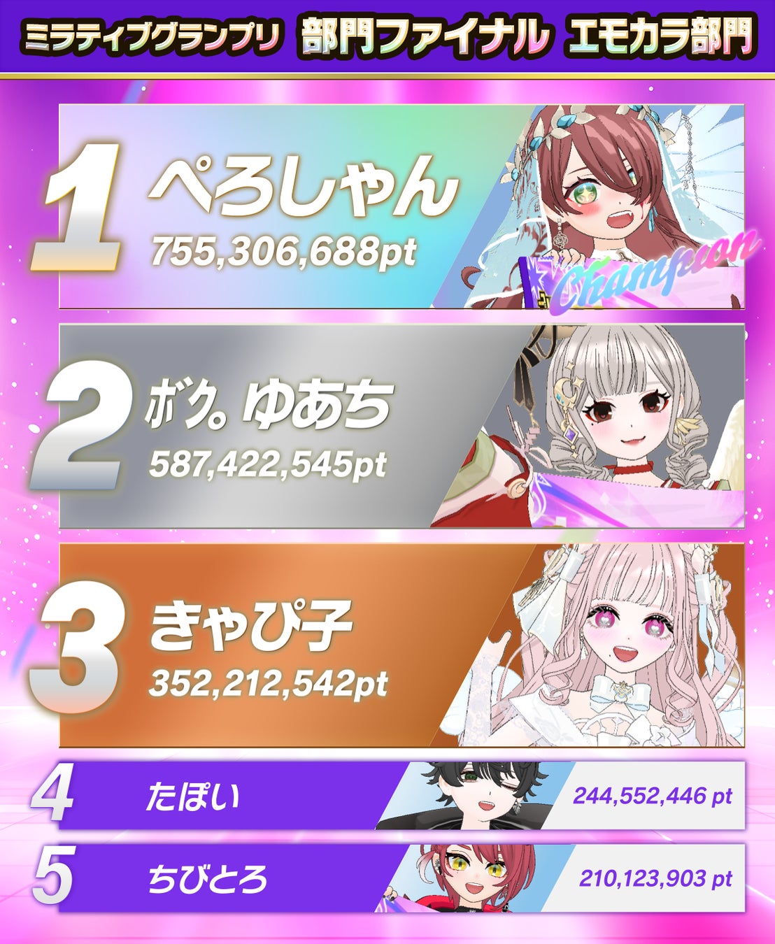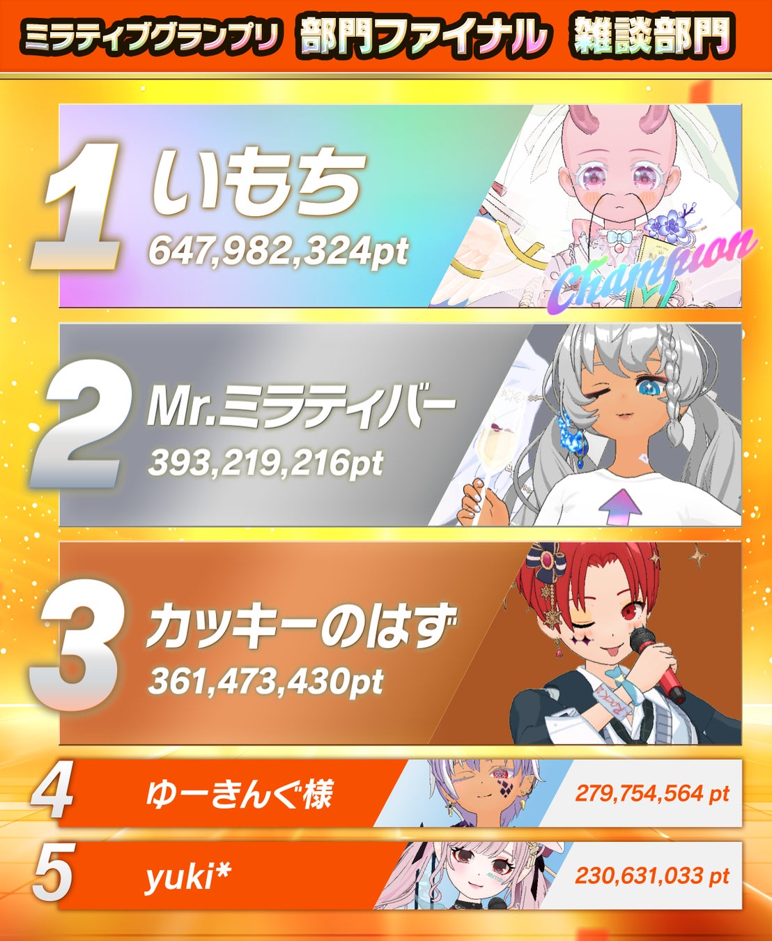 2025年1月23日(金)から1月25日(日)にかけて行われた「部門ファイナル」において、「ゲーム部門」「エモカラ部門」「雑談部門」の各部門上位5位までの入賞者がグランドファイナルへの進出を決めました。部門ファイナルのチャンピオンと上位入賞者には豪華賞品も贈られます。