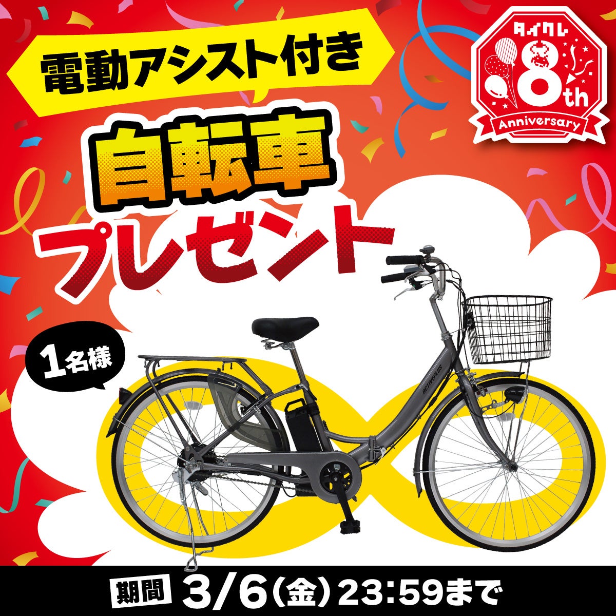 期間中、タイクレに新規登録いただいた方の中から抽選で1名様に電動アシスト付き自転車をプレゼント。