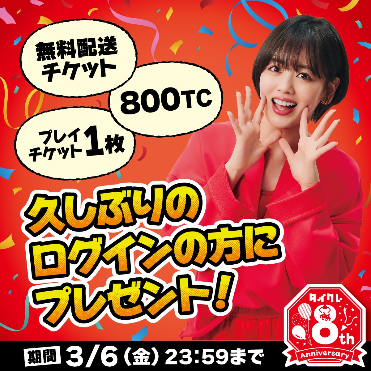 8.久しぶりにタイクレにログインのお客様に、800TC&無料配送チケット、さらにプレイチケットプレゼント