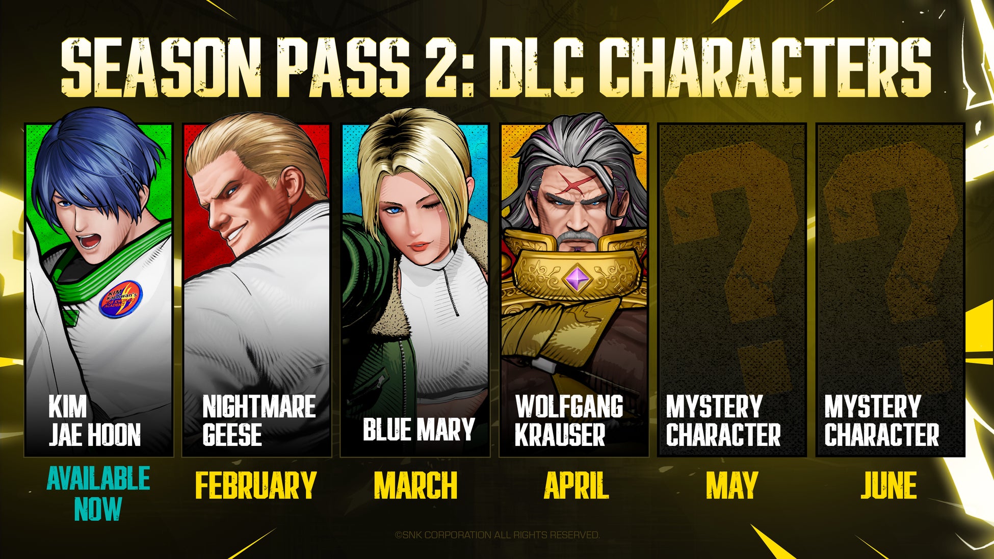Season Pass 2では、『餓狼伝説』シリーズより「キム・ジェイフン」「ナイトメアギース」「ブルー・マリー」「ヴォルフガング・クラウザー」の4キャラクターに加え、後日発表予定のミステリーキャラクター2体を含む、全6キャラクターを毎月順次配信予定。Season 2の配信開始にあわせて、本編+Season Pass 1+Season Pass 2をまとめて楽しめる「餓狼伝説 City of the Wolves Legend Edition」は、6,490円(税込)でお求めいただけます。今後のアップデートで追加されていくキャラクターたちも使用可能となりますので、ぜひこの機会に『餓狼伝説 City of the Wolves』で、新シーズンの盛り上がりをお楽しみください。