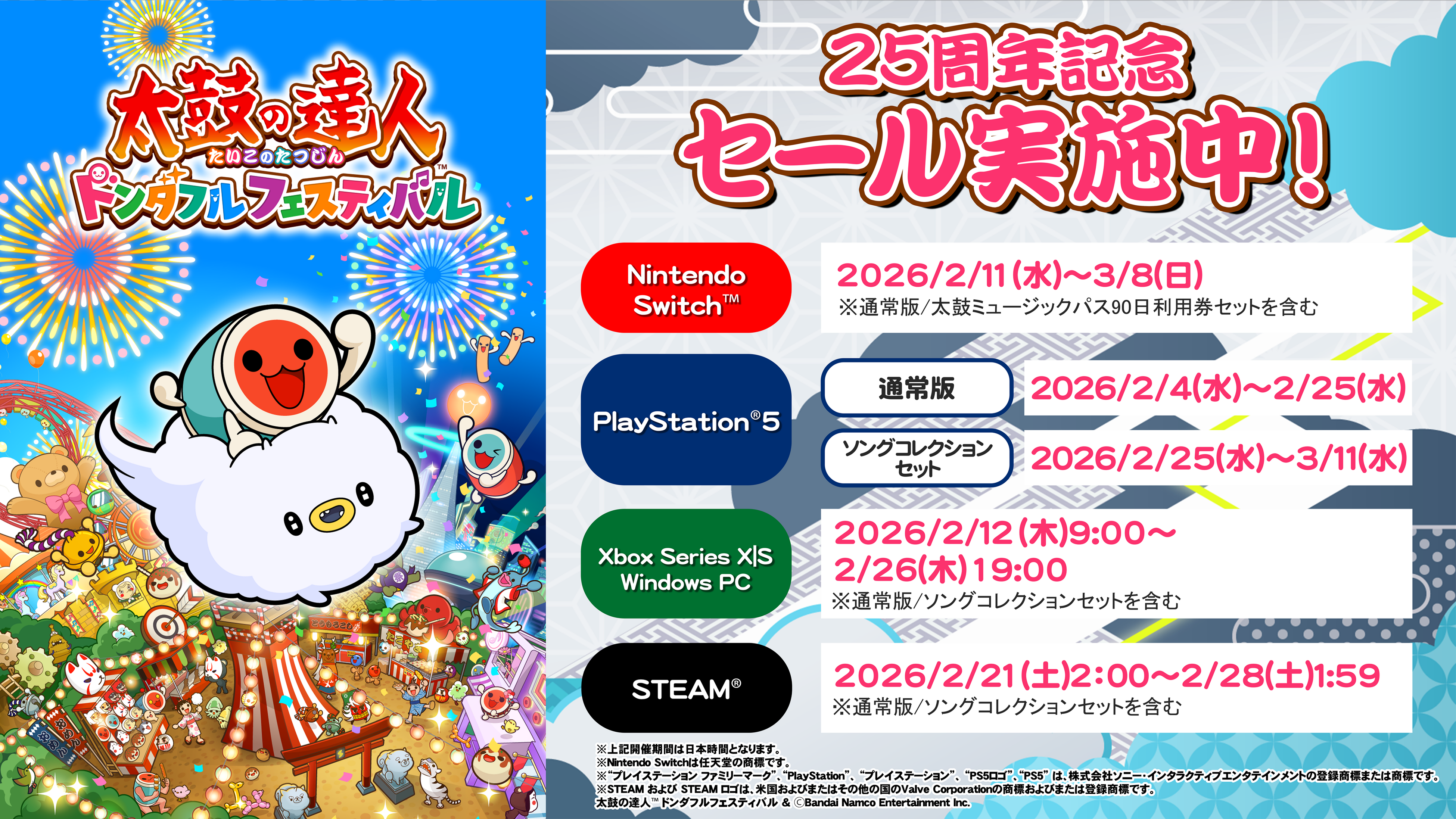 以下の期間中、各プラットフォームで販売中の『太鼓の達人 ドンダフルフェスティバル』がお得な価格で購入できます!ぜひこの機会にプレイしてみてください♪
