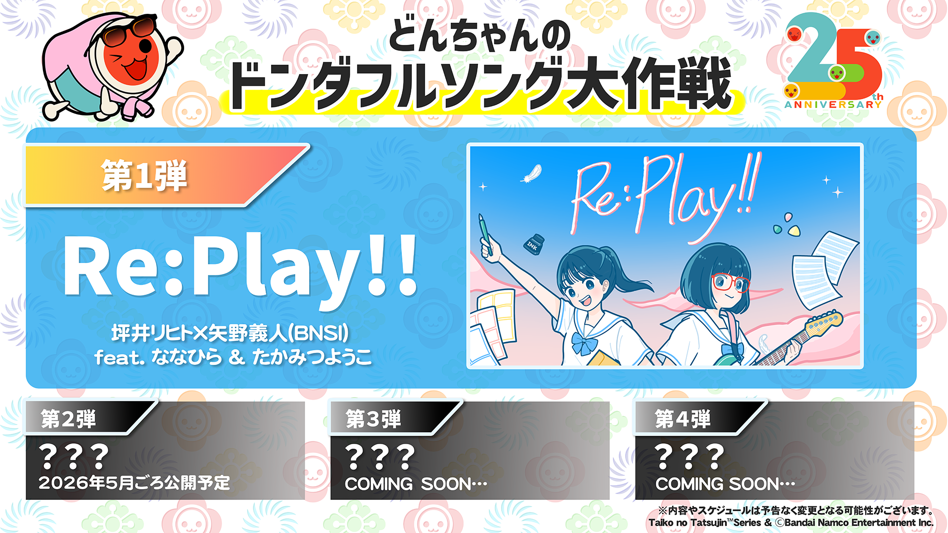 現代的なサウンドをベースに、「太鼓の達人」を代表する名曲を彷彿とさせるメロディを随所に散りばめた一曲です。ななひらさんのキュートな歌声と、たかみつようこさんの温かく優しい歌声が重なり合い、25周年の幕開けにふさわしい楽曲に仕上がっています。ぜひ聴いてみてください♪