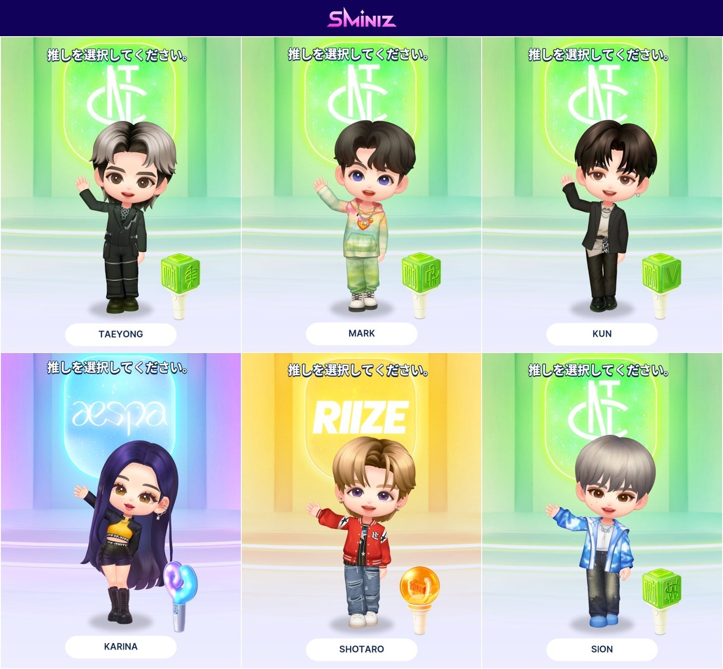 「SMiniz」には、「NCT 127」「NCT DREAM」「WayV」「aespa」「RIIZE」「NCT WISH」の6つのグループが登場します。