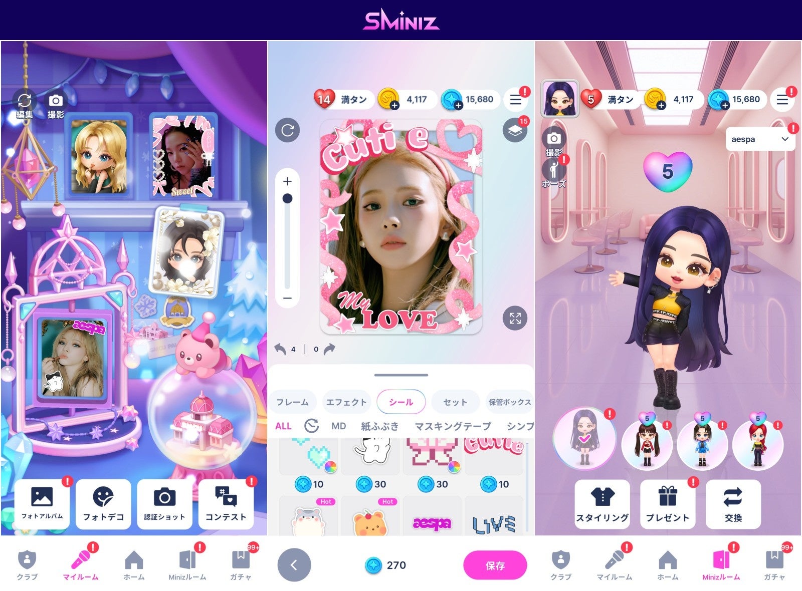 「SMiniz」は、実際のアイドルファンダム文化を取り込んでいます。「フォトデコ」では、シーズンごと獲得できるステッカーを使いフォトカードをデコレーションすることができます。デコレーションしたフォトカードは、コンテスト形式のコンテンツで他のユーザーに披露することができます。