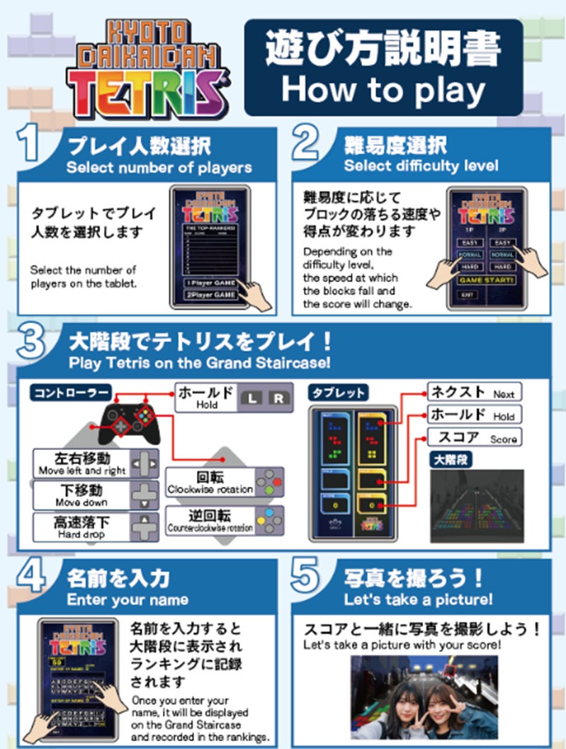 参加者は、大階段に映し出されるテトリス画面で、専用コントローラーを使ってゲームを楽しむことが出来ます。ぜひこの機会に皆様のご参加をお待ちいたしております。