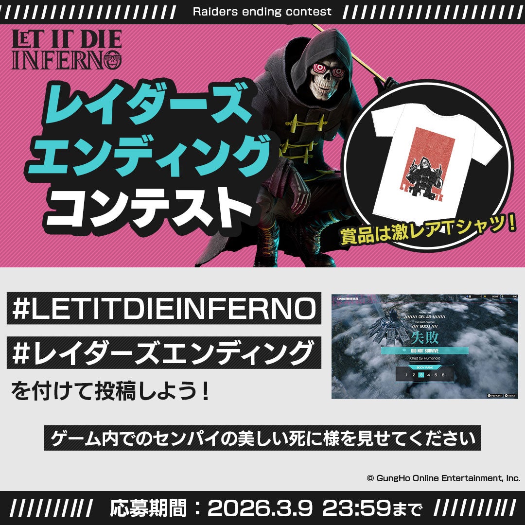 ①【撮影】『LET IT DIE: INFERNO』での「死にざま」動画を撮影。 ②【フォロー】「公式アカウント ( @LETITDIE_jpn )」をフォロー。 ③【ポスト】Xで、ポスト本文の先頭にハッシュタグ「#LETITDIEINFERNO #レイダーズエンディング」(計2つ)をつけて動画を投稿。 ※ポスト本文は、ハッシュタグと動画以外の内容を含めても構いません。 |