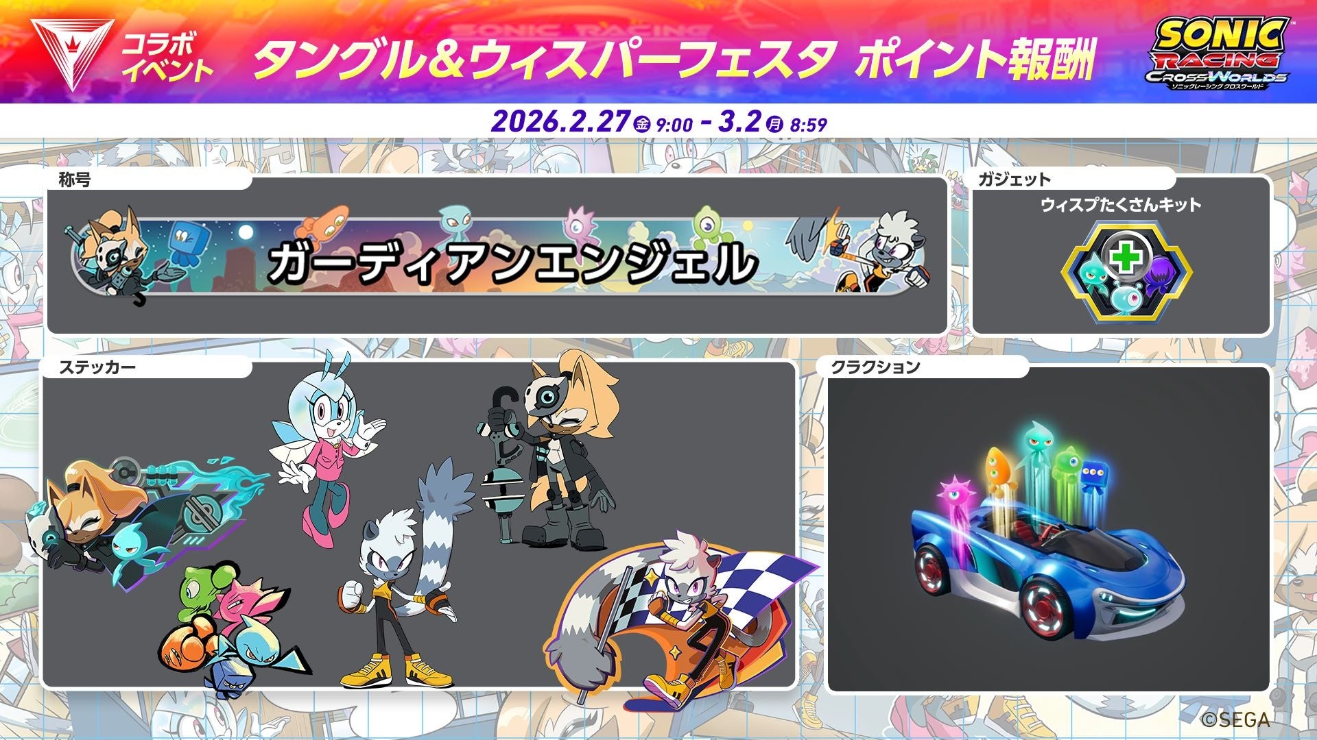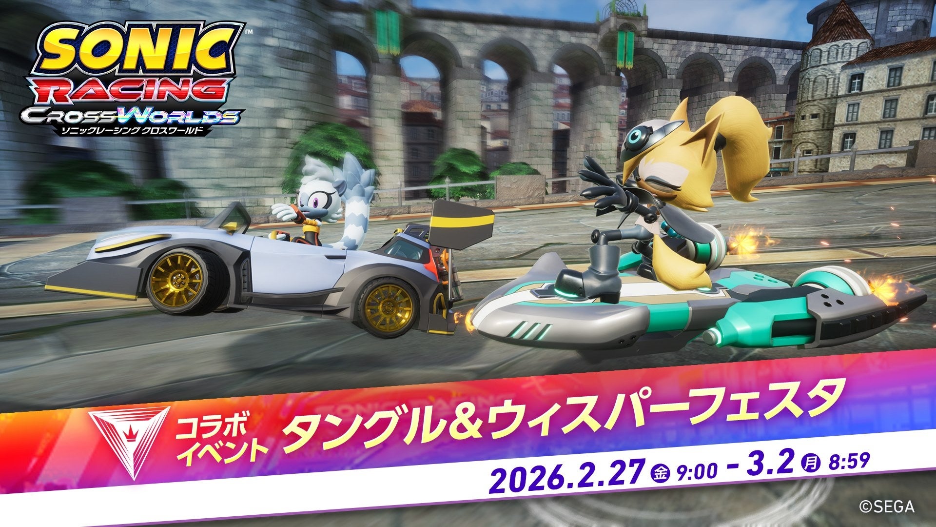 株式会社セガは、好評発売中の『ソニックレーシング クロスワールド』について、無料アップデート「タングル&ウィスパー」の配信を本日2026年2月26日(木)より開始しました。タングルとウィスパーは、IDWコミックシリーズ『ソニック・ザ・ヘッジホッグ』に登場するソニックの頼れる仲間で、陽気なキツネザルと寡黙なオオカミのキャラクターです。