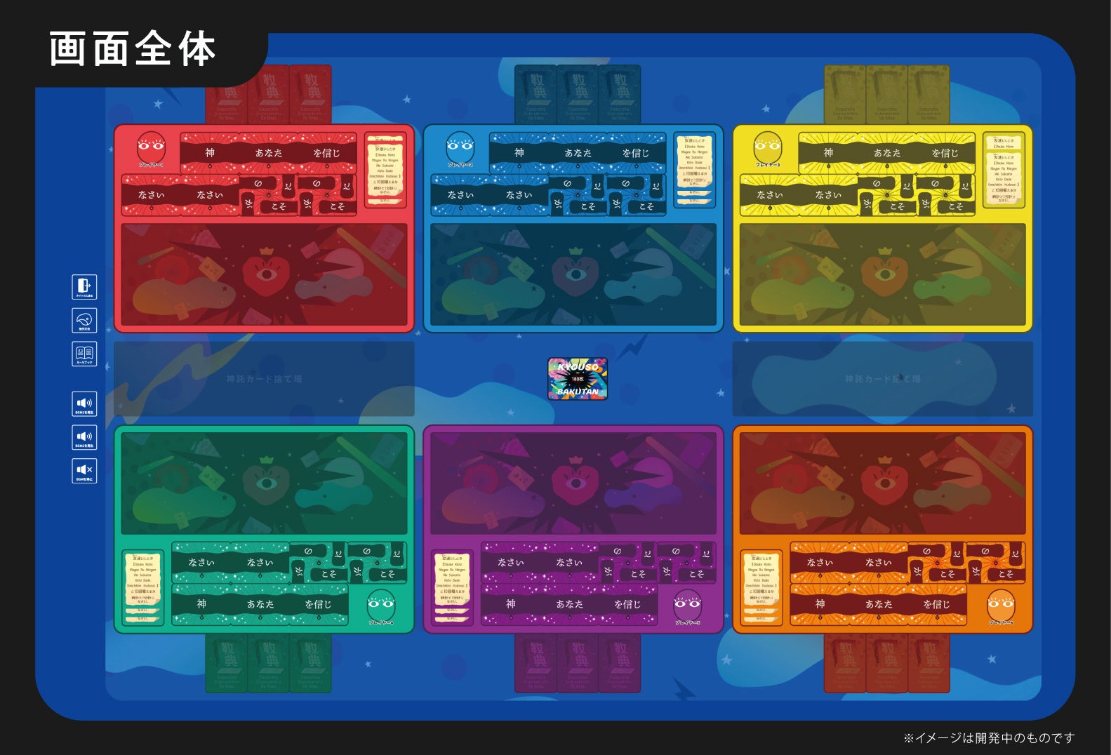 個人スペースでは、全員が同じ内容の「初期カード」と山札からランダムに引く「神託カード」を自由に組み合わせて「神のお告げ」を作ることができます。
