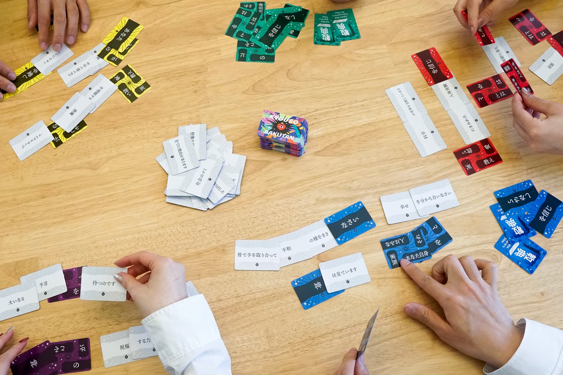 ルールはとっても簡単。制限時間内に、配られた手札を自由に組み合わせて「神のお告げ」を作り、親プレイヤー(悩める人間)の心を掴んだら得点となります!