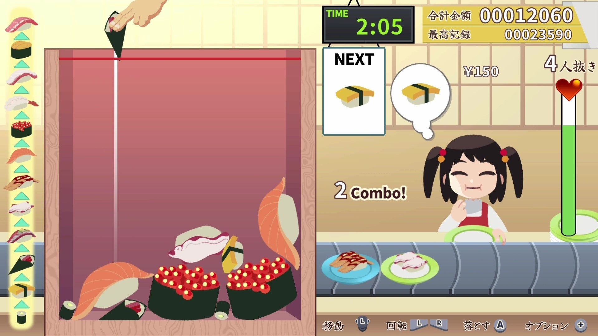時間融解系パズルゲーム『元祖 落とし寿司 めびうす』は、お寿司を落として、同じネタ同士をくっつけて「幻の大トロ」を目指す、落ち物系物理パズルゲームです。