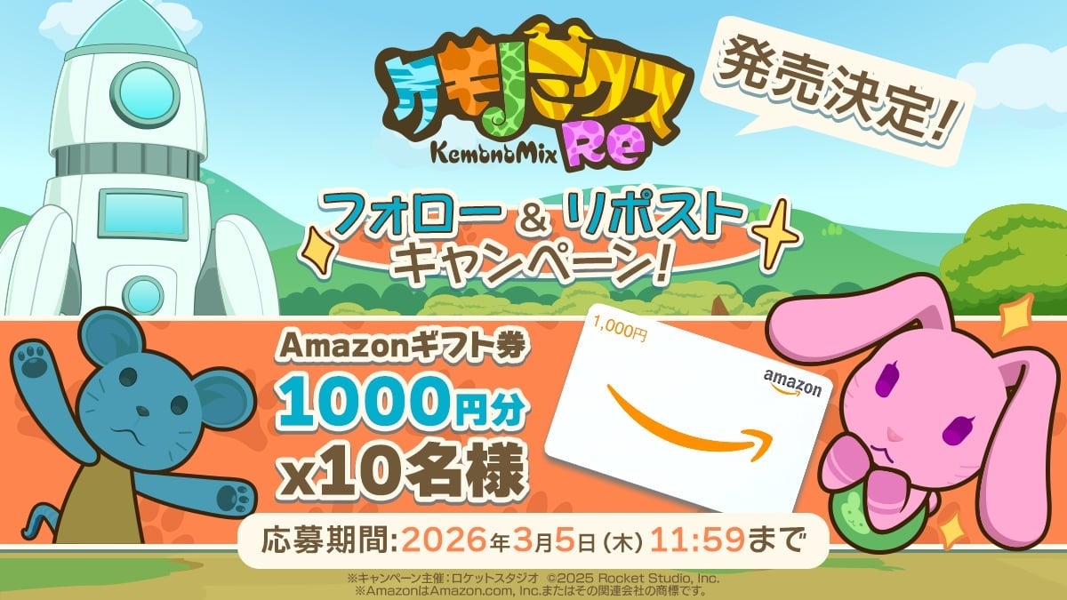 株式会社ロケットスタジオ(本社:札幌、代表取締役:竹部隆司)は、新作ゲーム『ケモノミクスRe』を「Nintendo Switch」ならびに「Steam」にてダウンロード専用ソフトとして2026年3月19日に発売することをお知らせいたします。あわせて、本日よりSteamストアページを公開いたしました。また、発売決定を記念し、公式X(@kemonomix)にてフォロー&リポストキャンペーンを実施いたします。