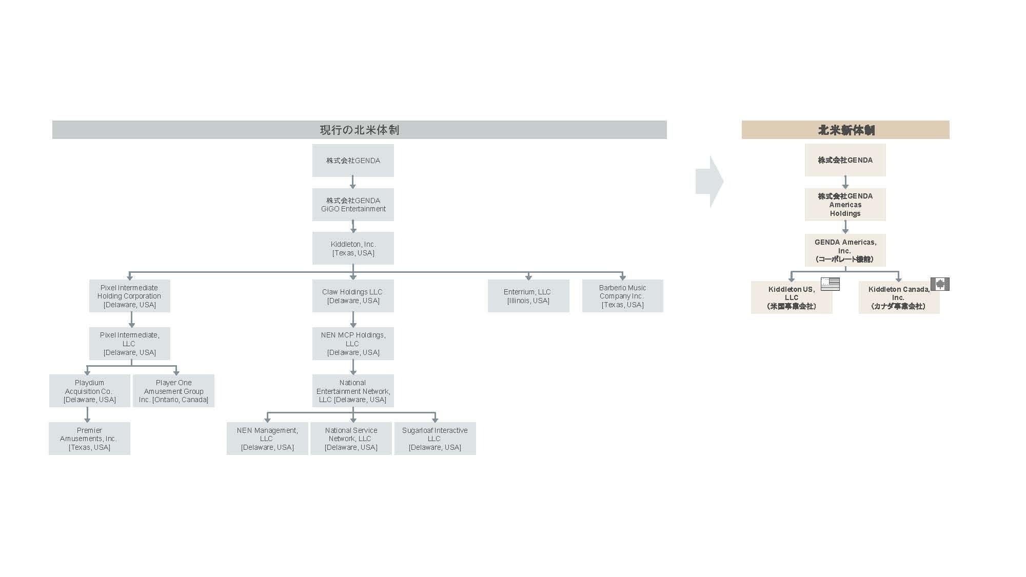北米における新体制において、グループ各社に共通するコーポレート機能をGENDA Americas, Inc.に集約すると共に、米国での事業統括をKiddleton US, LLCへ、カナダでの事業統括をKiddleton Canada, Inc.へ統合いたします。この再編により、組織体制の最適化を実現すると同時に、営業活動における提案力の強化や意思決定の迅速化を図り、事業運営全体の効率化と競争力の向上を目指します。各社のノウハウを迅速かつ横断的に共有することで、当社が北米で展開している12,000箇所以上のミニロケ(主に30台以下のゲーム機を設置するゲームコーナー)の改善施策を加速度的に進め、ミニロケを日本と北米を繋げるプラットフォームとして益々成長させてまいります。