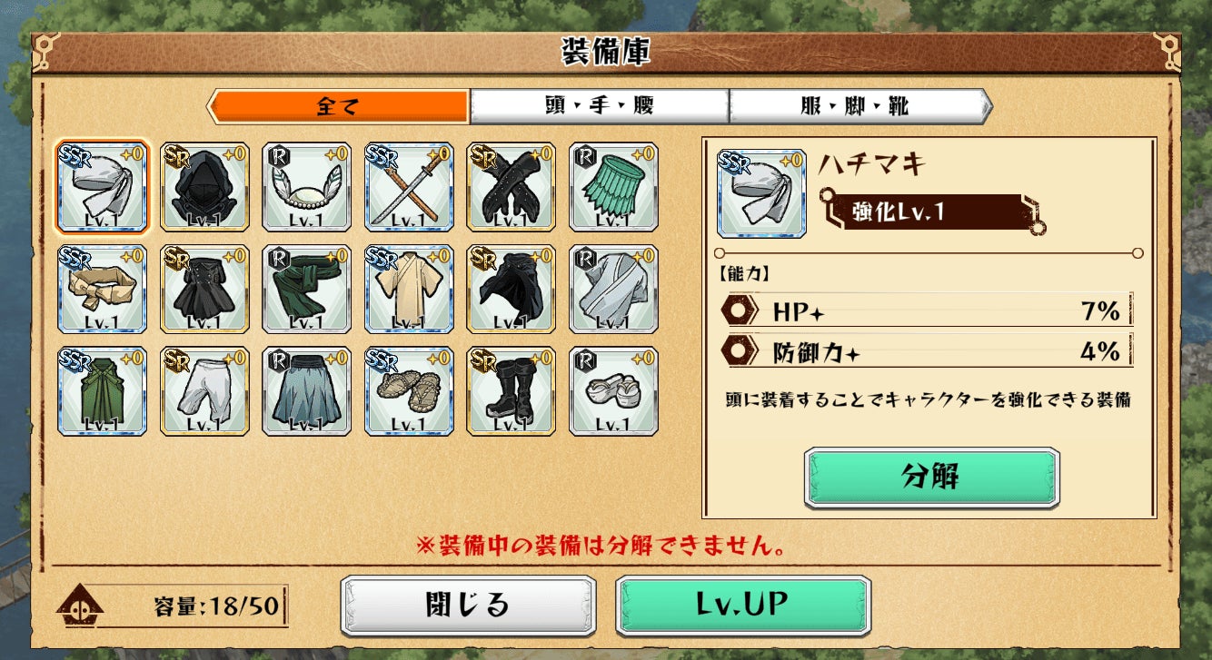 装備には「頭・手・腰・服・足・靴」の種類があり、部位によってHP、攻撃力、防御力が強化されます。