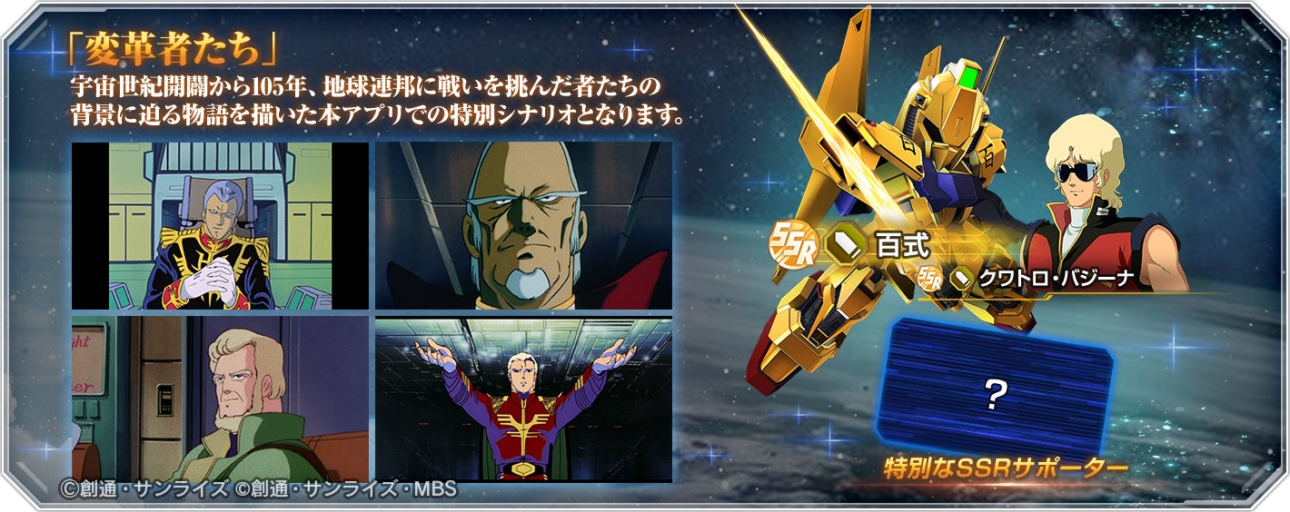 「変革者たち」をクリアすると、SSRユニット「百式」やSSRキャラクター「クワトロ・バジーナ」、そして『機動戦士ガンダム 閃光のハサウェイ キルケーの魔女』を記念した特別なサポーターを報酬として獲得できます。