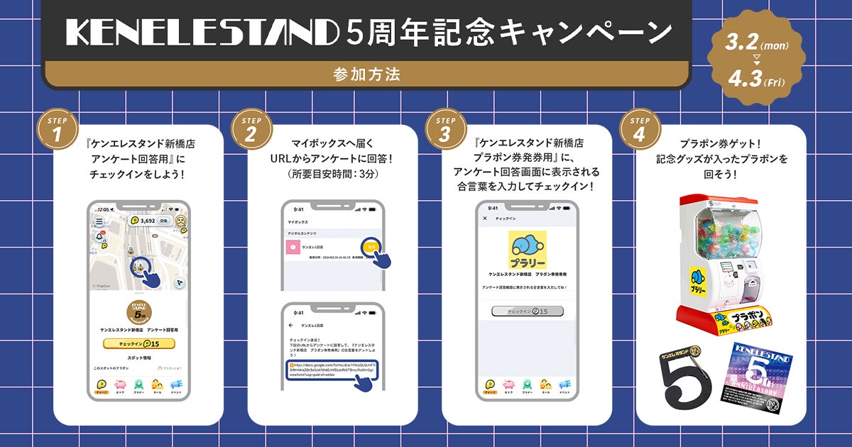 本企画は、KENELE STAND 5周年を記念して、ケンエレスタンド 新橋店において開催されるデジタルスタンプラリーです。参加者はアプリ『プラリー』上でチェックインし、アンケートに回答することでプラポン券を獲得。本企画限定の景品と交換することができます。アニバーサリーの記念として景品をお持ち帰りいただくことで、店舗への訪問および回遊促進に貢献します。