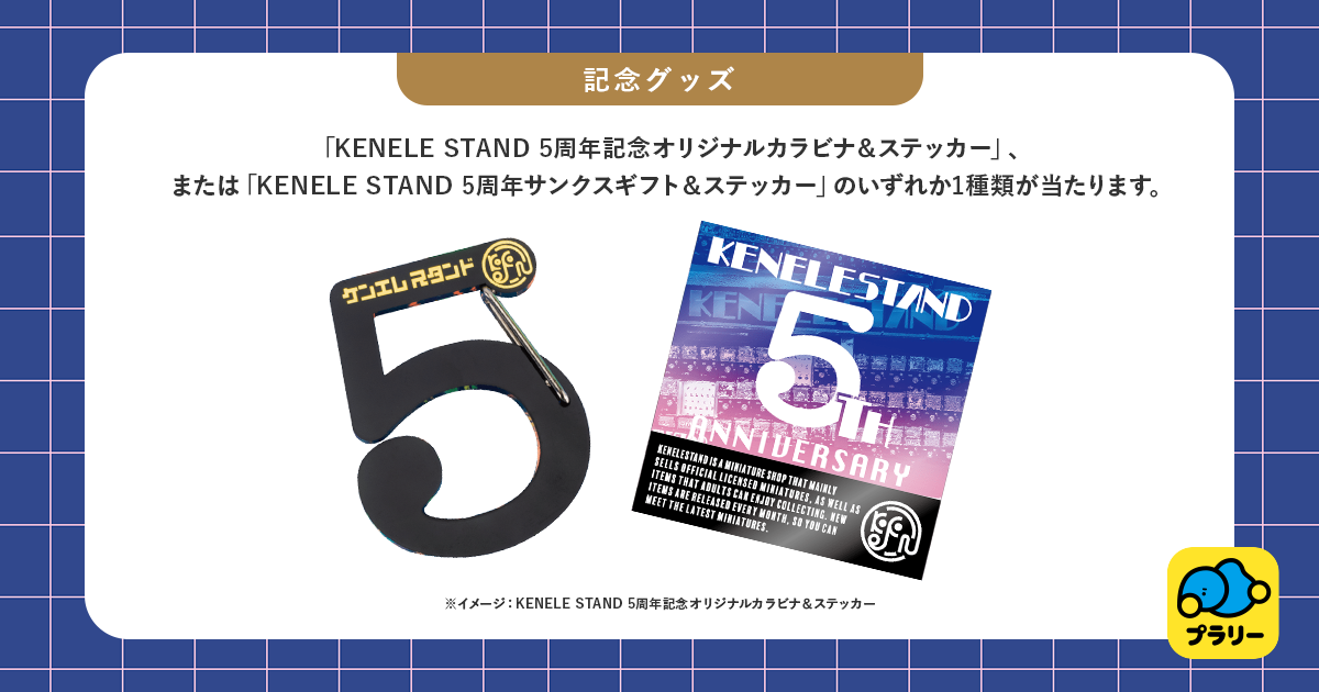 「KENELE STAND 5周年記念オリジナルカラビナ&ステッカー」、または「KENELE STAND 5周年サンクスギフト&ステッカー」のいずれか1種類が当たります。