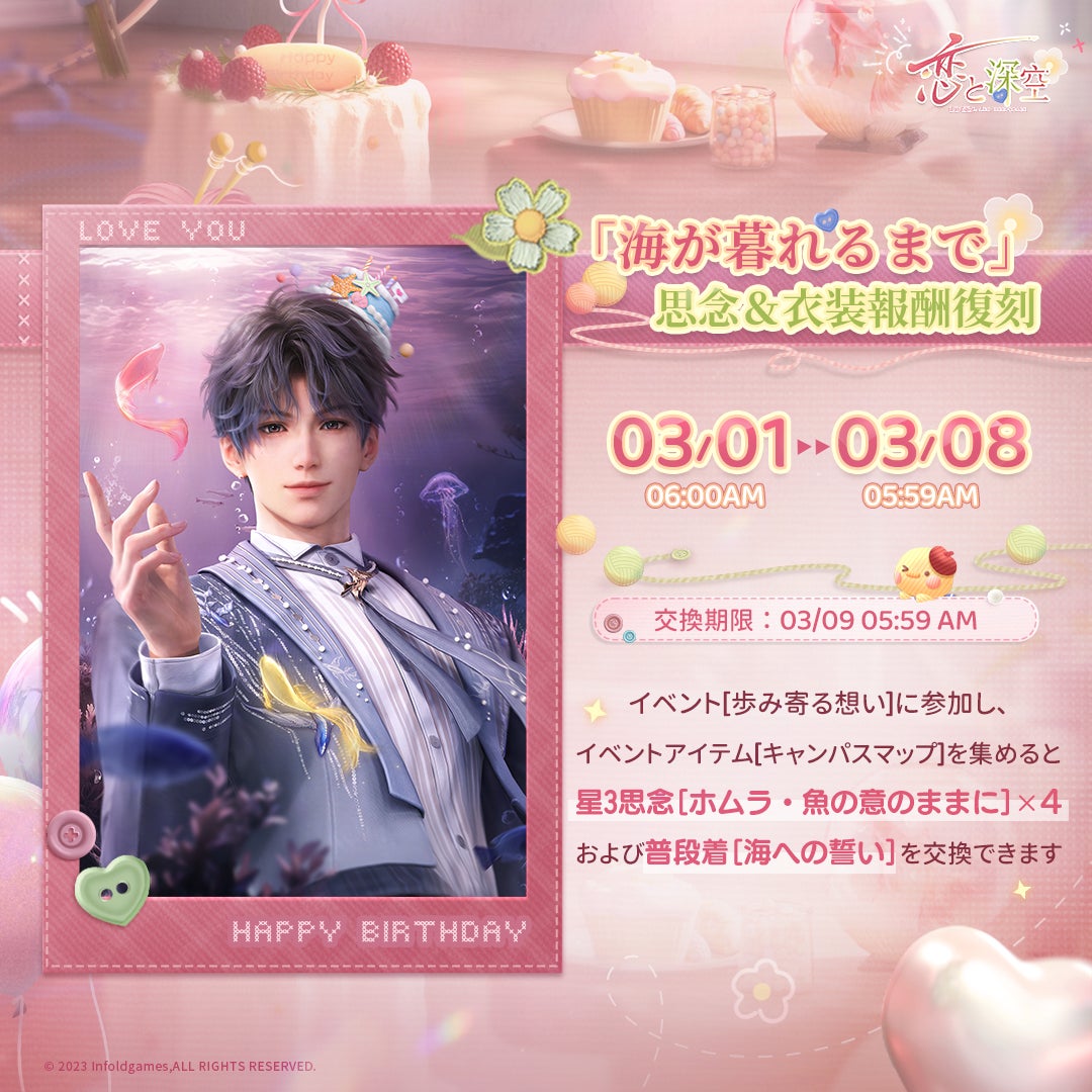 INFOLD PTE. LTD.は、全世界ユーザー数が8000万人を突破した恋愛シミュレーションゲーム『恋と深空』において、3月1日(日)6時より、ホムラ誕生日イベント「歩み寄る想い」を開催することをお知らせいたします。