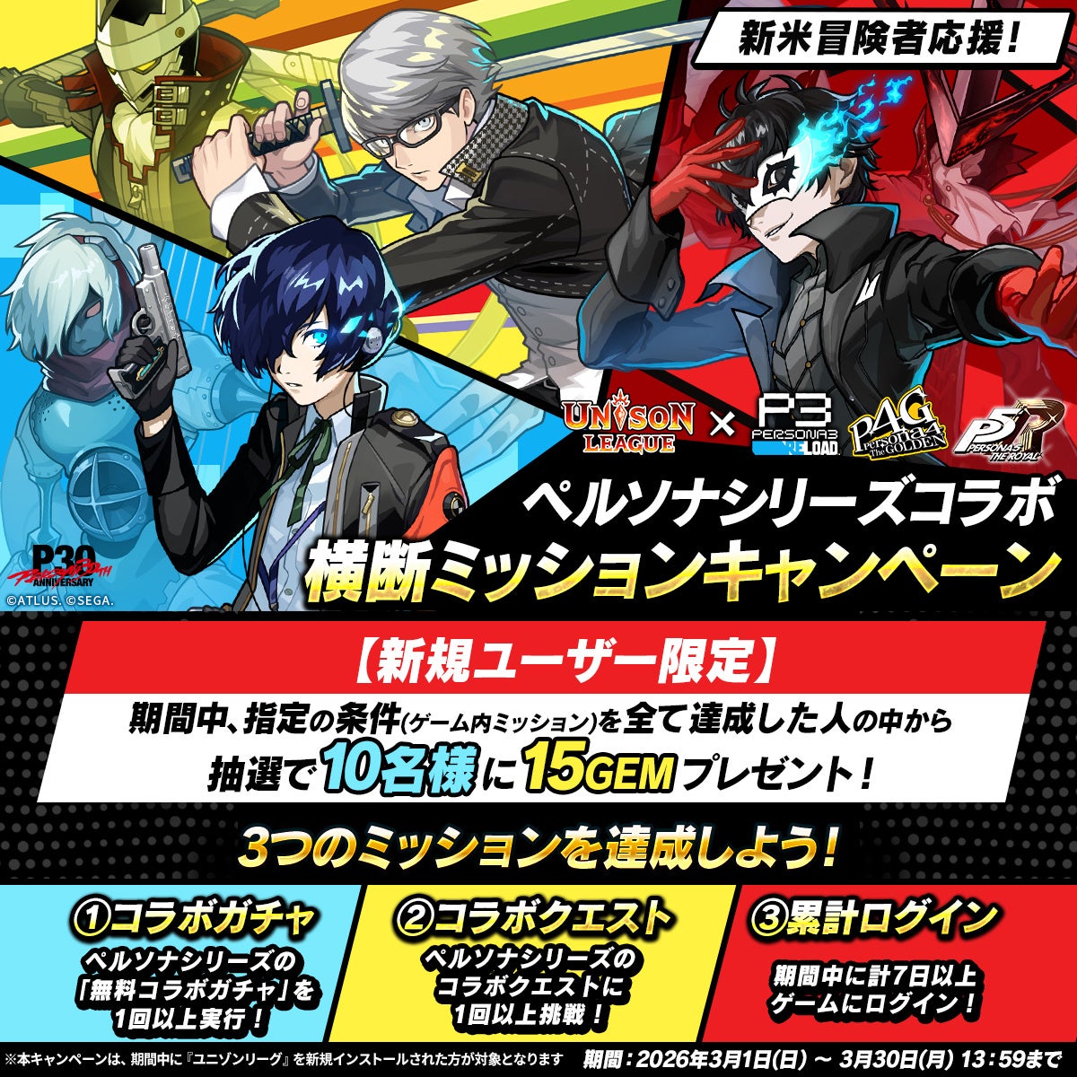 創造性と技術力で多様なITサービスを展開する株式会社エイチームホールディングスのグループ会社である株式会社エイチームエンターテインメント(本社:愛知県名古屋市、代表取締役社長:中内之公)は、スマートフォン向けに配信中のRPG『ユニゾンリーグ』にて2026年3月1日(日)より、『ペルソナ』シリーズとのコラボを開催します。