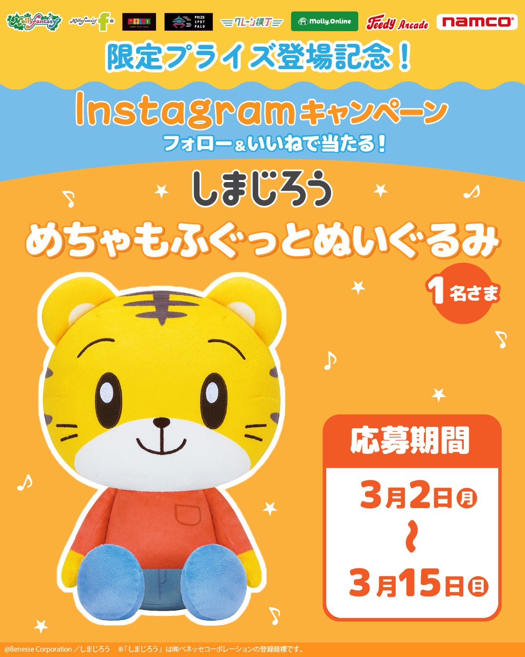 限定プライズ用景品の展開を記念し、モーリーファンタジー公式X・Instagramでは、「しまじろう めちゃもふぐっとぬいぐるみ」が抽選でX:4名さま、Instagram:1名さまに当たるSNSキャンペーンを開催いたします。詳細は公式アカウントをご確認ください。