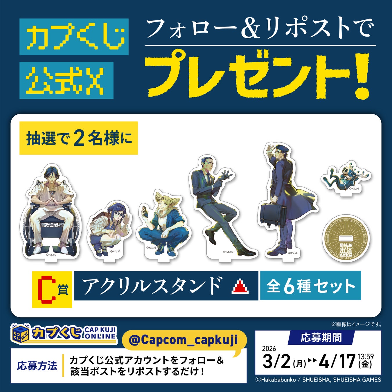 こちらは“RP賞”と題して、カプくじオンラインのアカウントをフォローし、対象のポストをリポストすることで、抽選で2名様に「C賞:アクリルスタンド(全6種)」コンプリートセットをプレゼントいたします。是非この機会をお見逃しなく!