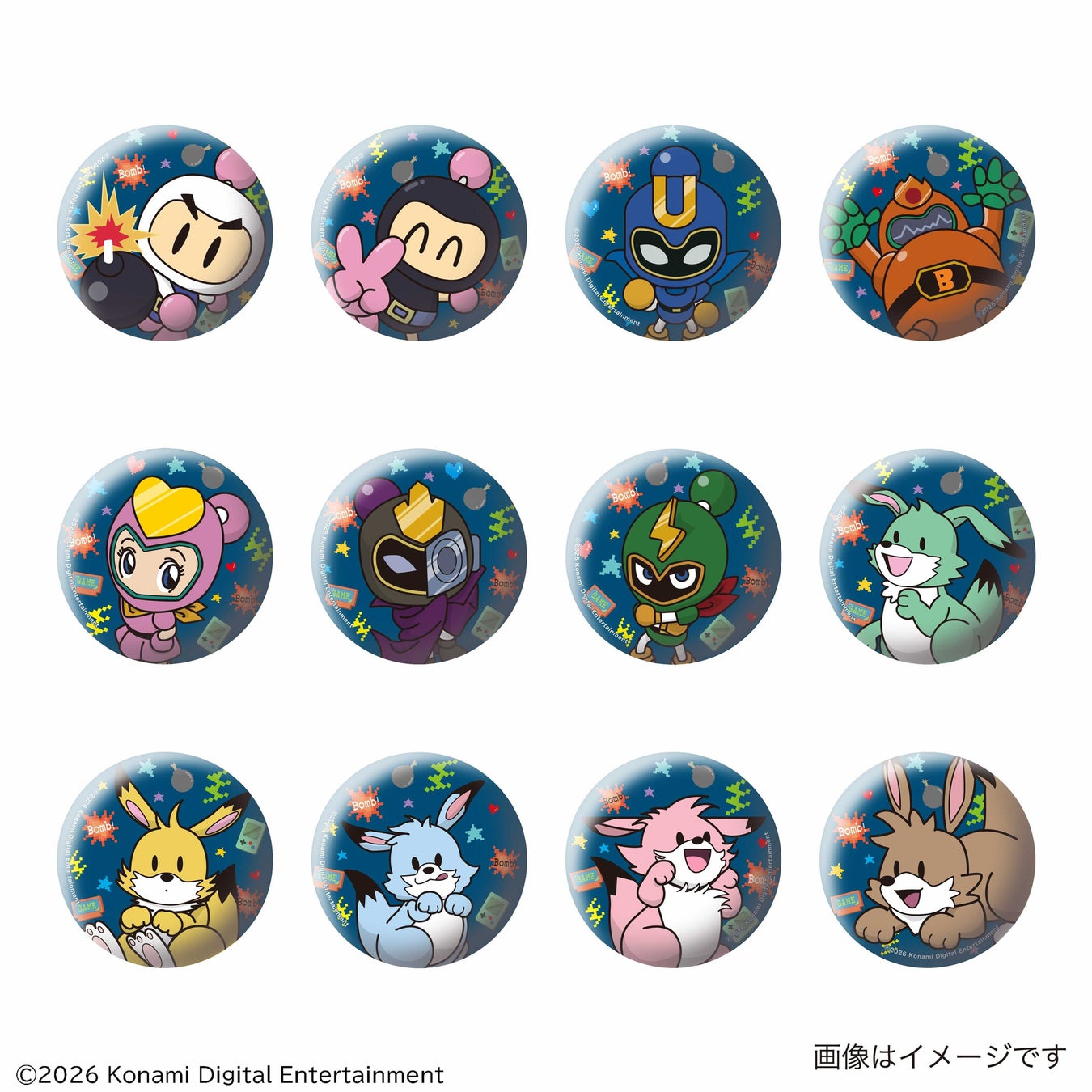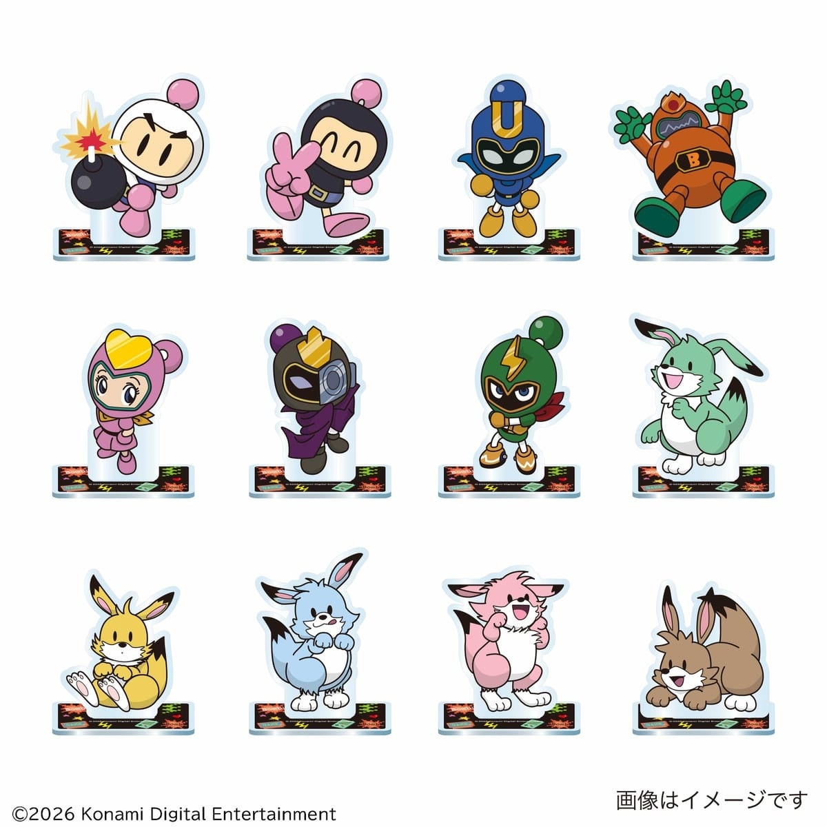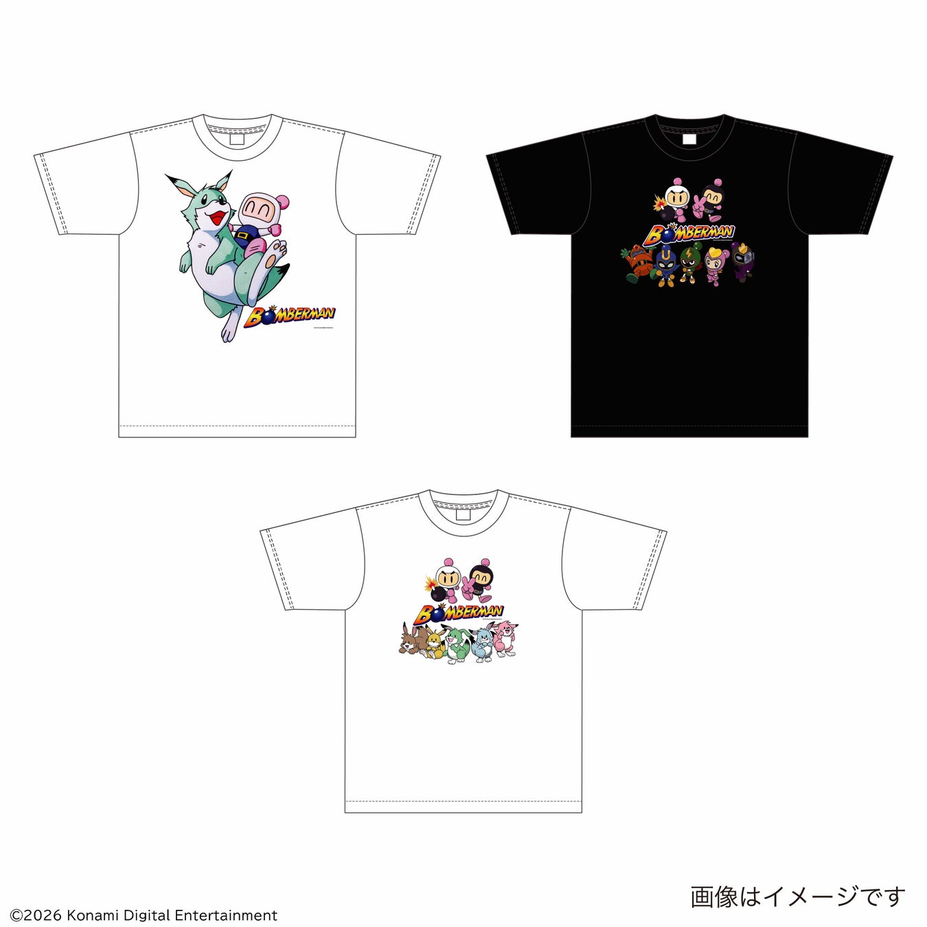 今回の限定グッズでは、KONAMIの人気ゲーム「ボンバーマン」シリーズおなじみの白ボン、黒ボン、ルーイと、