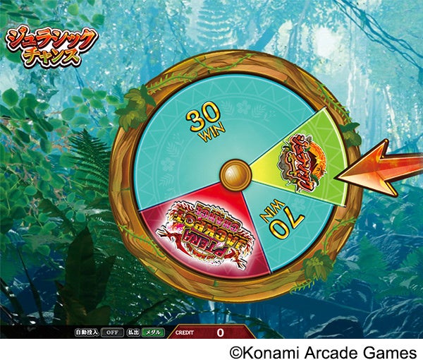 メダルや「ジュラシックモード」、「JACKPOT CHANCE」が当たる可能性があるルーレットをまわすことができます。「JACKPOT CHANCE」を当てれば、JACKPOT獲得を目指す、センターユニットを使った抽選に進むことができます。